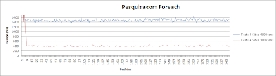 O gráfico apresenta os resultados dos testes com o método de ciclos Foreach. Da análise do gráfico nota-se um aumento significativo do tempo de pesquisa, mas mais do que este aumento é de reter que a pesquisa com mais itens oscilou entre os 1,4 segundos e os 1,6 segundos que se revelam tempos inaceitáveis para um sistema.