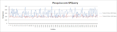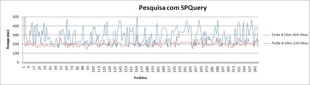 A figura acima apresenta os resultados para o teste ao método SPQuery. É de notar o decréscimo dos tempos médios de pesquisa (comparando com o método anterior) que diminuíram cerca de 80% para o teste com listas de 400 itens e 50% para o de 100 itens. Esta melhoria de resultados deve-se, em grande parte, à diminuição do número de acessos à base de dados para executar as pesquisas.